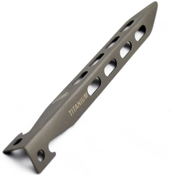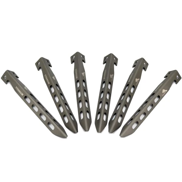 Each stake islightweight and durable due to its titanium alloy composition, and each stake is shaped to provide excellent ground and snow hold.